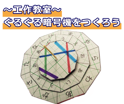| 内容 | 昔の暗号機にも使われていた回転の機構を利用した工作を行い、元の文を暗号文に変え、暗号文から元の文を復元してみましょう。暗号の仕組みについて学べます。 ※制作物はお持ち帰り可 ー参加費無料ー | |