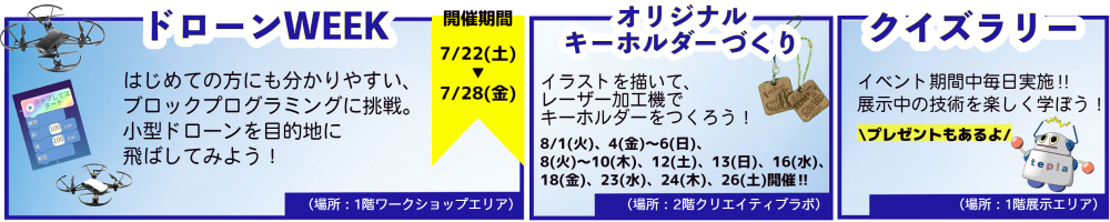 ※ドローンWEEK、オリジナルキーホルダーづくりのご体験は、各部おひとり様1回までとさせていただきます。